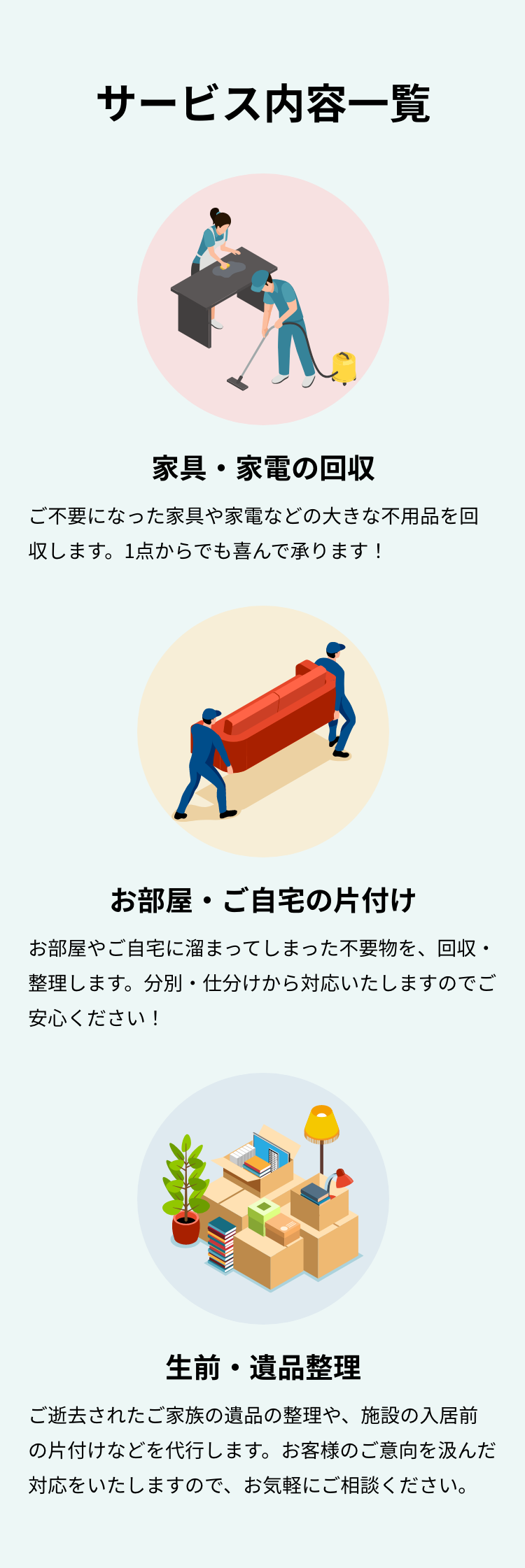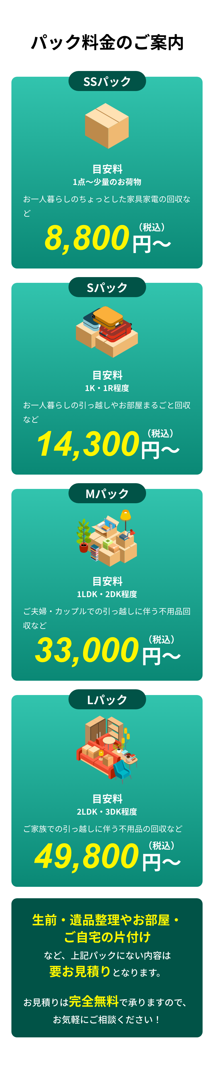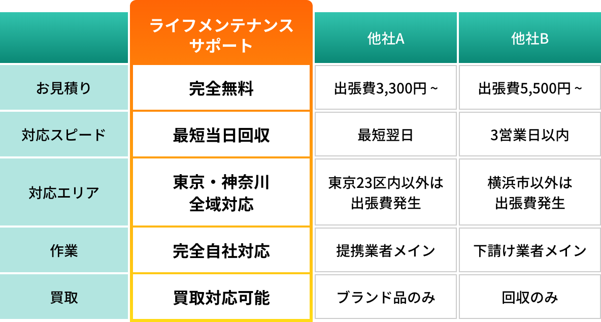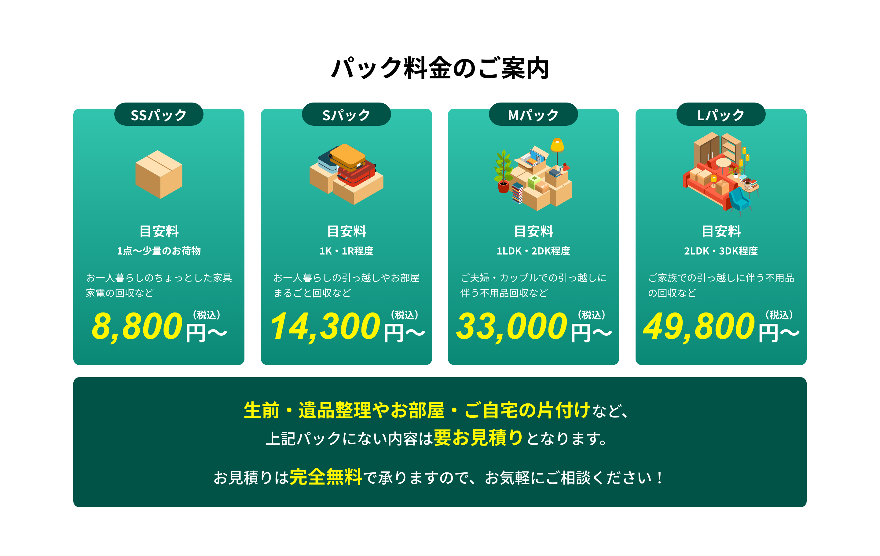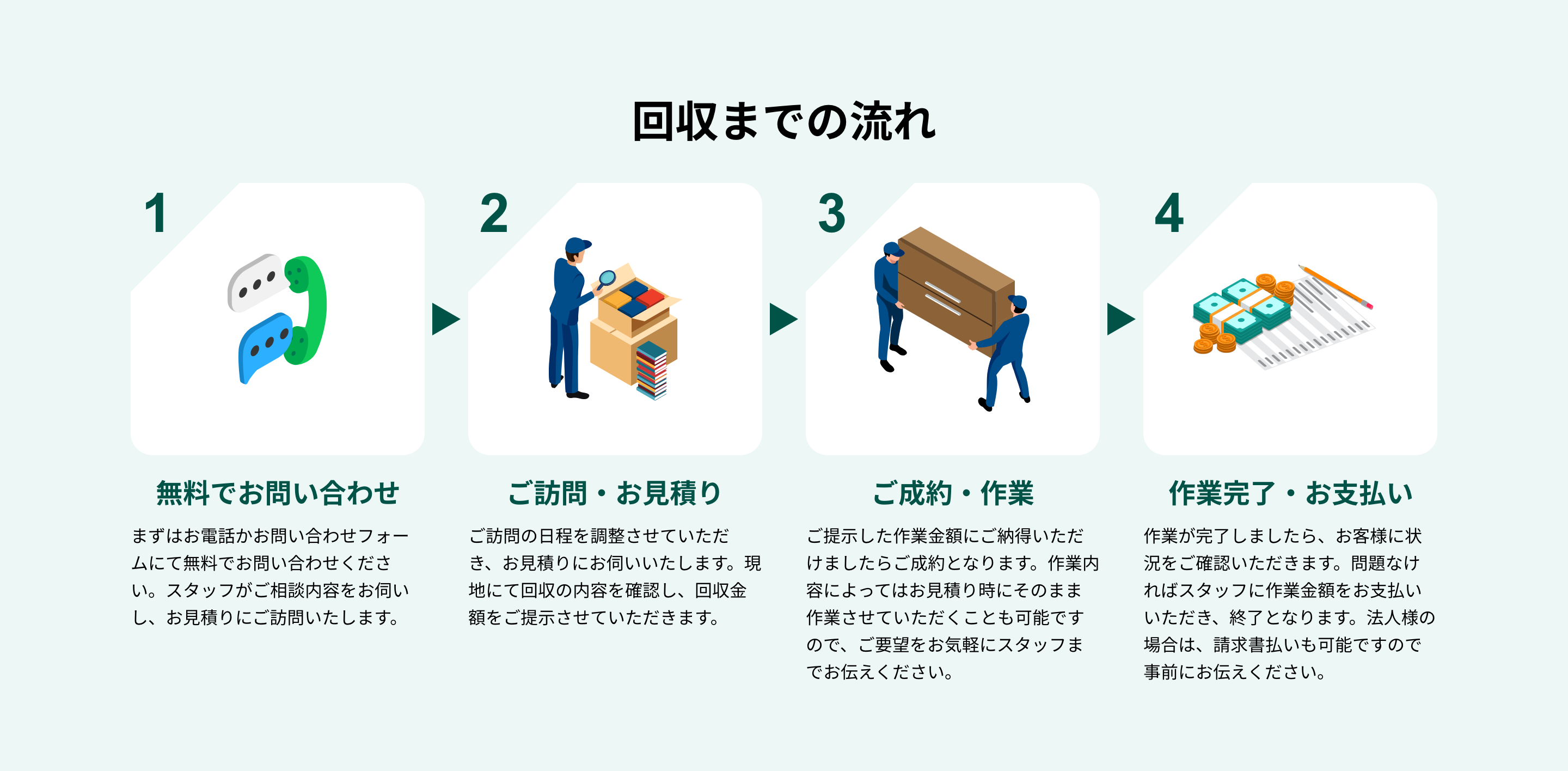A. お電話でお見積りが可能な場合もございますが、物の状態や大きさなど、現地で確認することでより正確なお見積りをお出しすることが可能ですので、ご訪問でのお見積りを推奨しております。