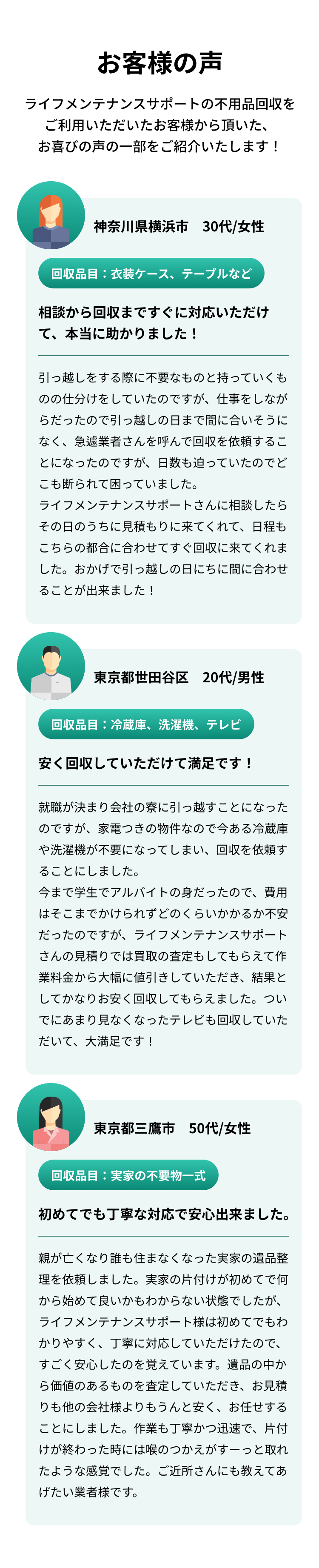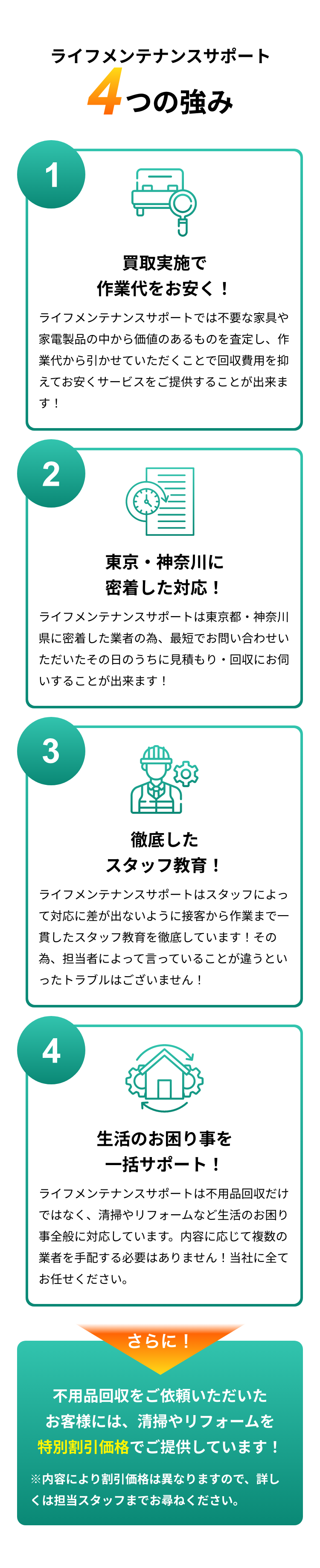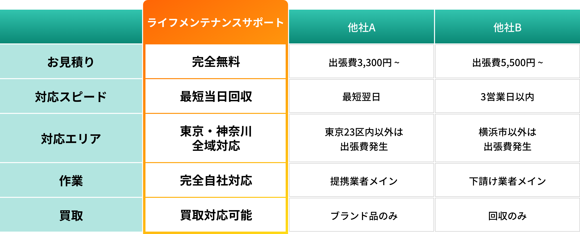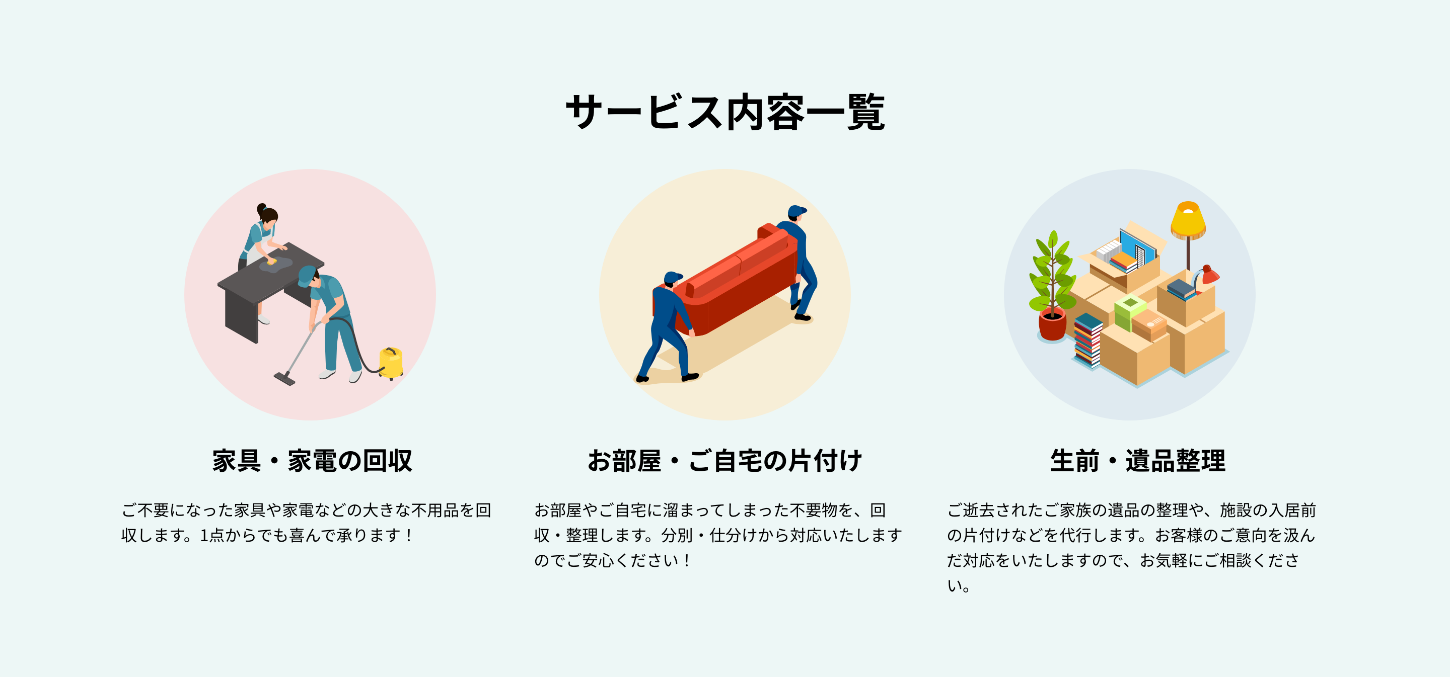 A. お電話でお見積りが可能な場合もございますが、物の状態や大きさなど、現地で確認することでより正確なお見積りをお出しすることが可能ですので、ご訪問でのお見積りを推奨しております。