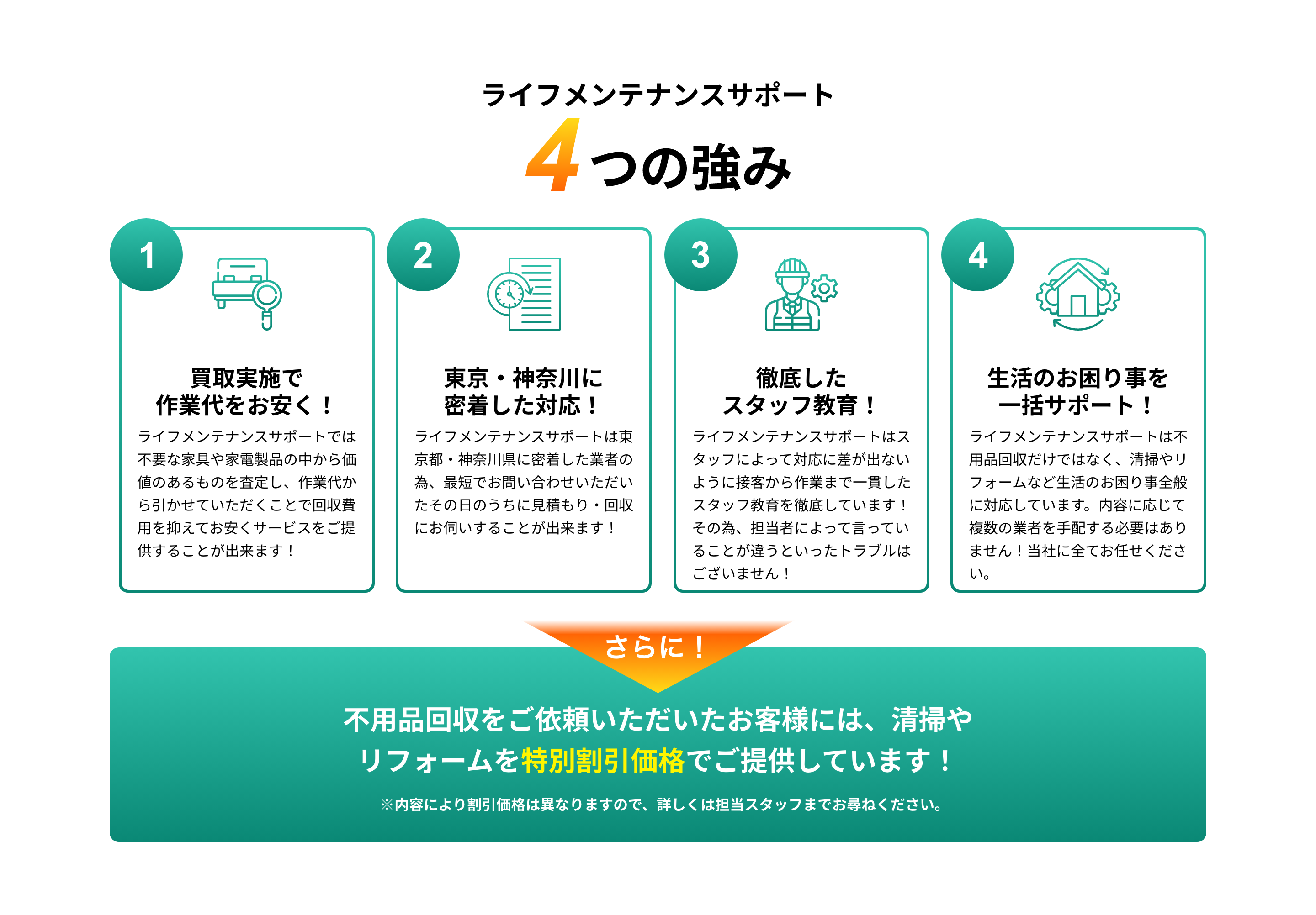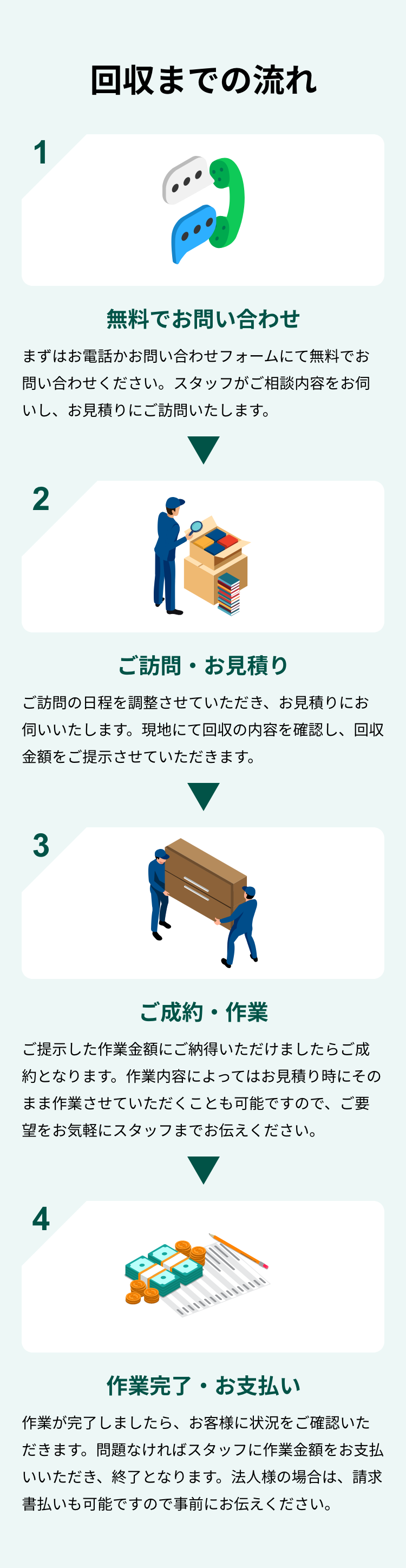 A. 作業内容やその日のスケジュールによりますが、お見積り後すぐに回収を行うことが可能な場合も多くございます。詳しくは現場でスタッフまでお尋ねください。