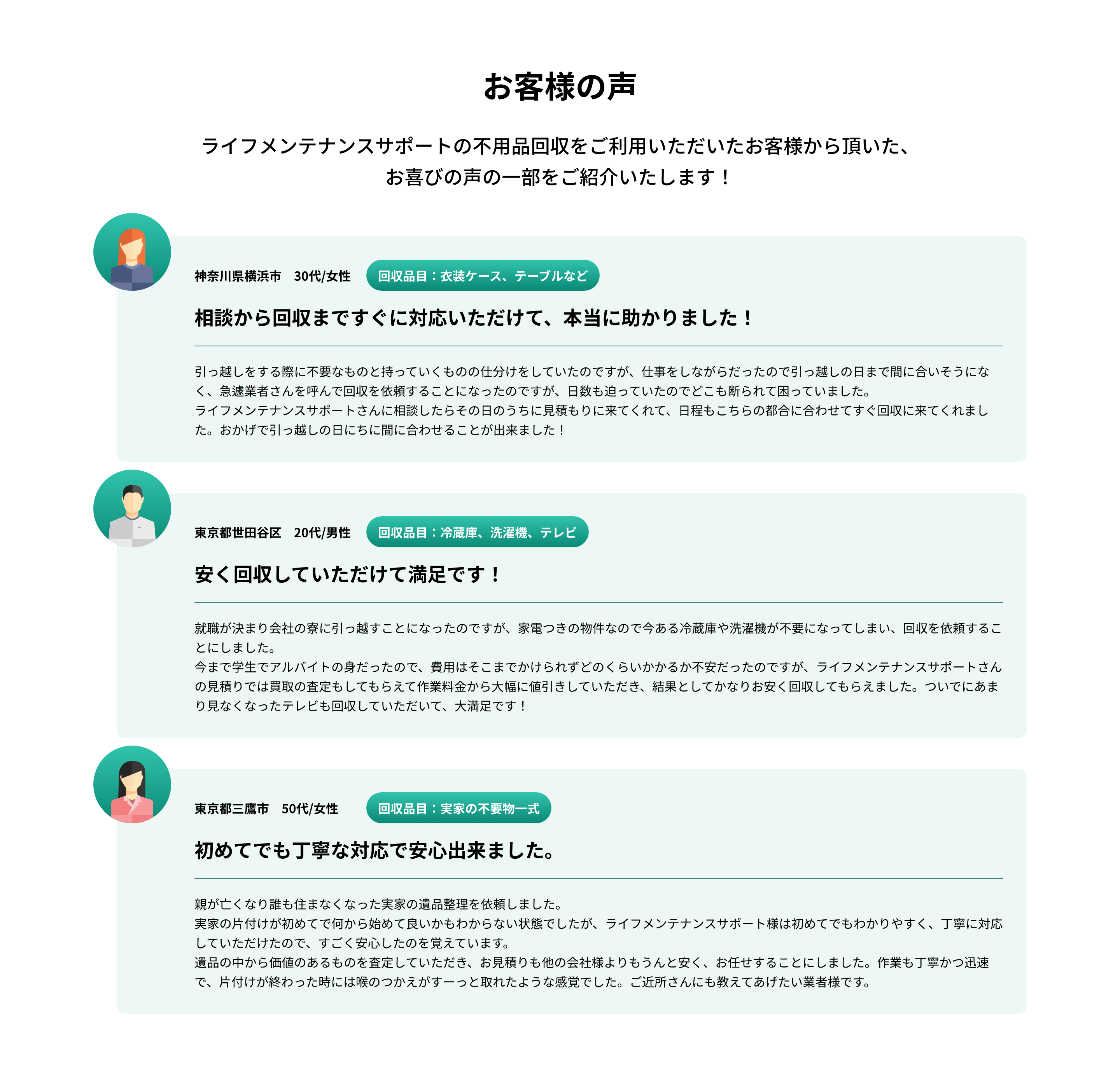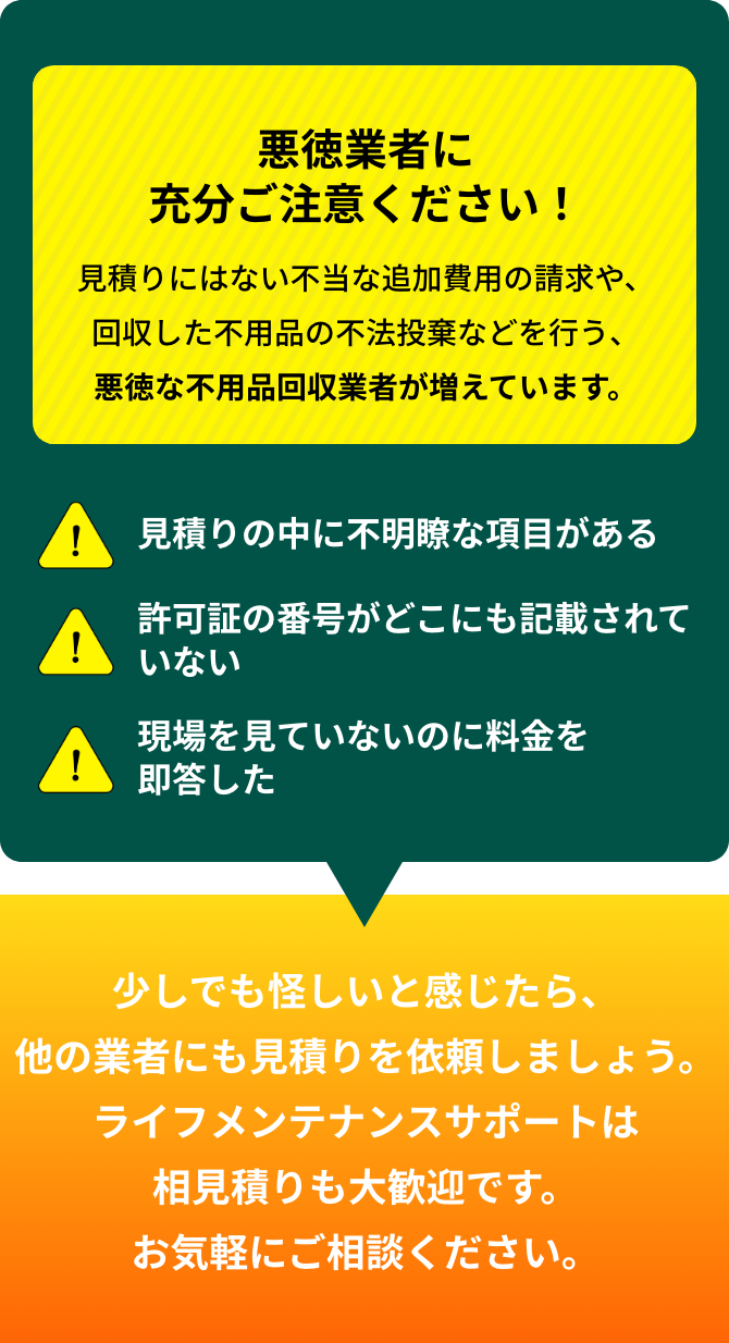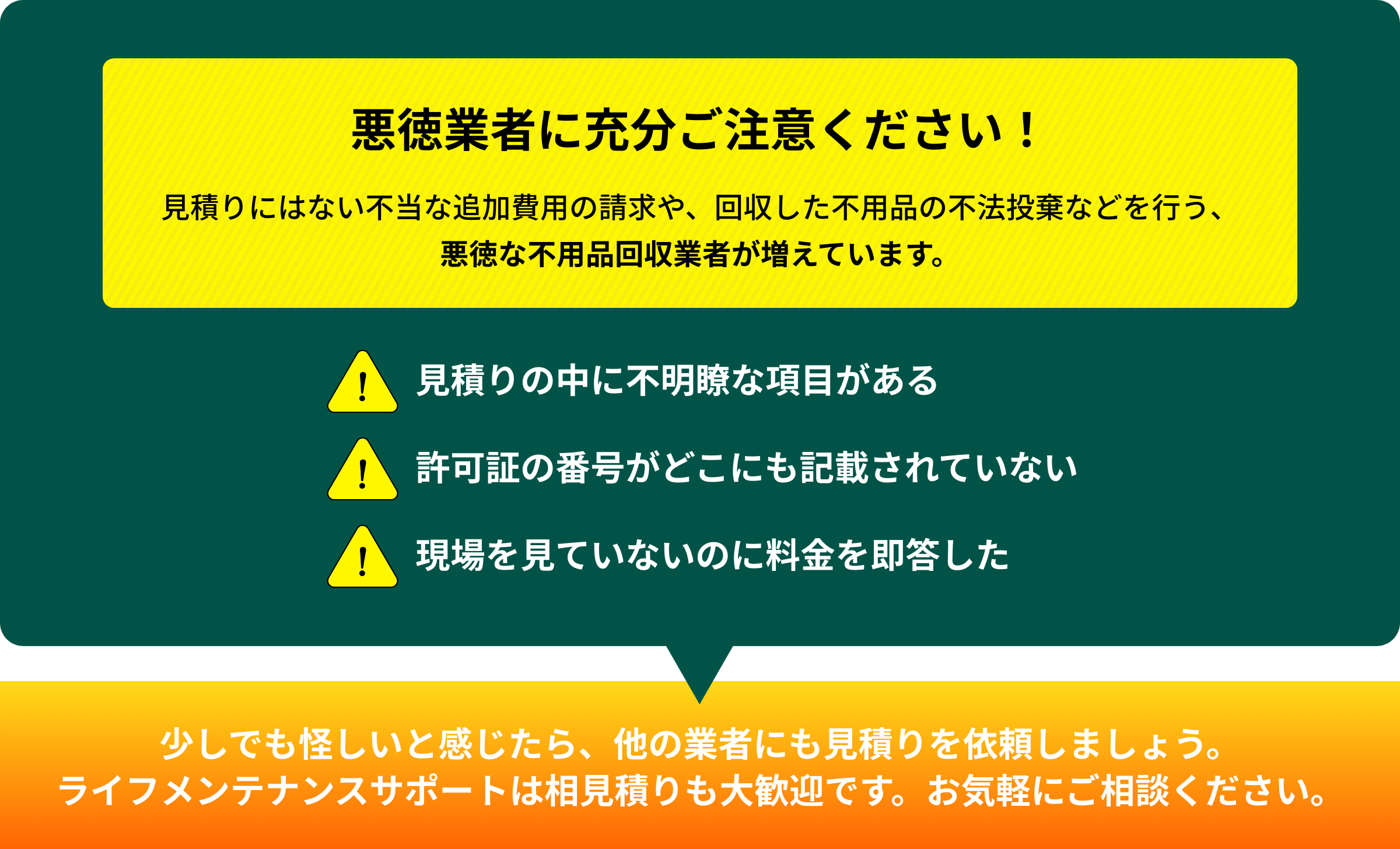 A. A:当社は自治体からの許可を保有しているだけでなく、様々な卸先業者とのお付き合いがございます。その為、回収物を不法に投棄したり、違法な処分を行うことはございません。安心してご依頼ください。